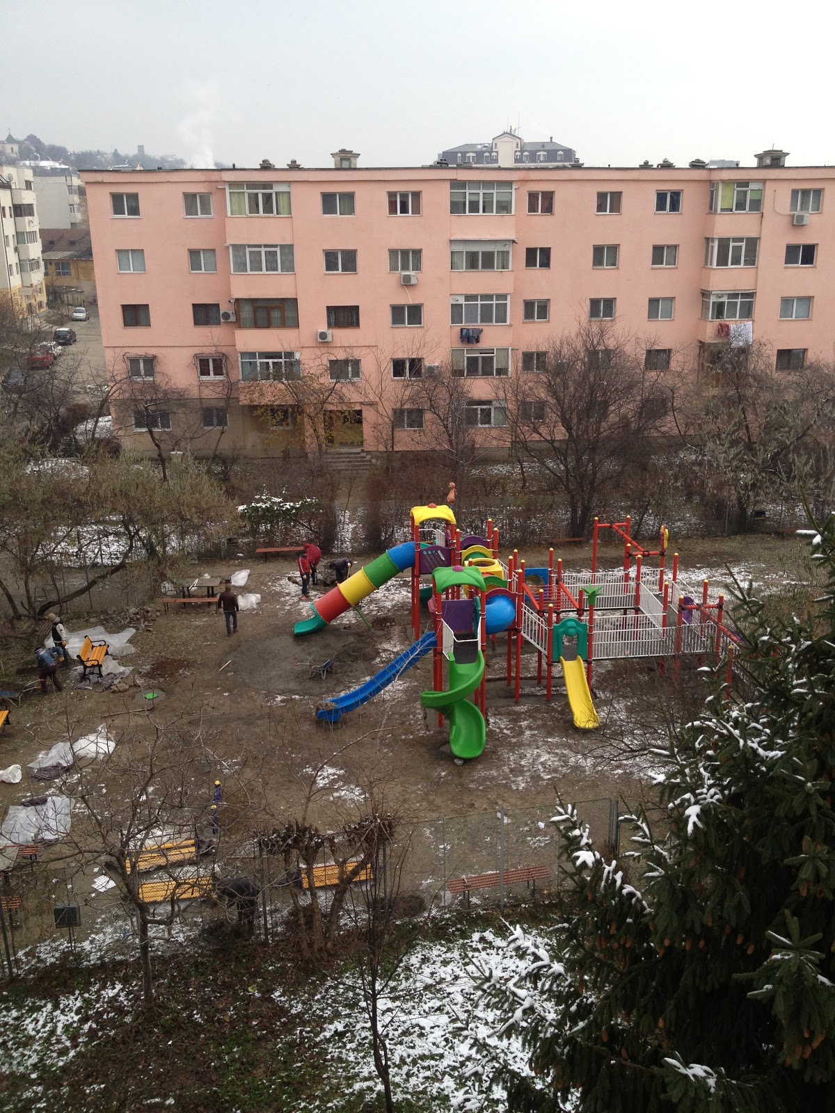 Weekend-ul trecut am fost trezită de sunetul utilajelor parcate frumos în parcul din spatele blocului. Cinci muncitori, înarmaţi cu fel de fel de echipamente, dădeau de zor cu montatul jucăriilor: balansoar, tobogan, scări, tuburi, căsuţe, bănci. Mult plastic, puţin lemn şi niciun copil. Ca o bătrânică de modă veche, nu ca alea de la fostul bloc, de fumau pipă şi erau mereu dichisite, am privit spectacolul de la geam.